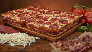 For the next two months Little Caesars will be selling a deep dish pizza wrapped in over 3 feet of bacon. ..