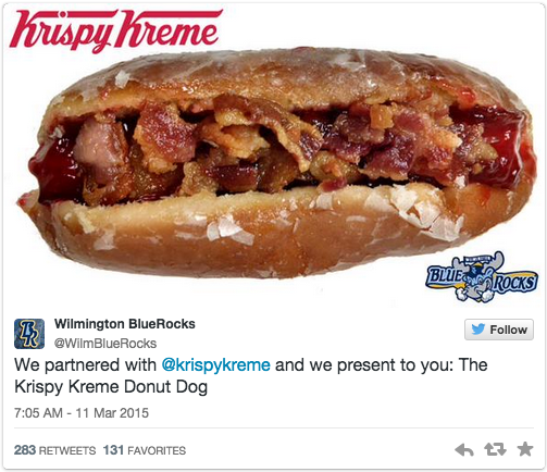 I don’t even know who the Wilmington BlueRocks are but I do know that they are selling quite possibly the best ballpark food. The Krispy Kreme Donut Dog is exactly what you expect: a hotdog with a Krispy Kreme donut for a bun.