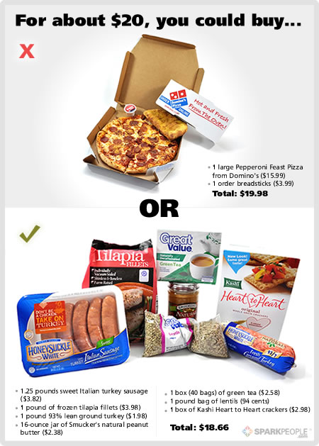 Buying food from the grocery store is highly cost effective and can save you a ton of money. If you want the gut you’ve always dreamed of, you’ll have to make an investment in your food choices. Just check out the picture above (from SparkPeople) and you will see how much more food you get by going to the grocery store. Don’t be fooled. If you look carefully you will notice that all of that food is healthy and won’t provide you with the proper amount of calories and fat needed to reach your goals.